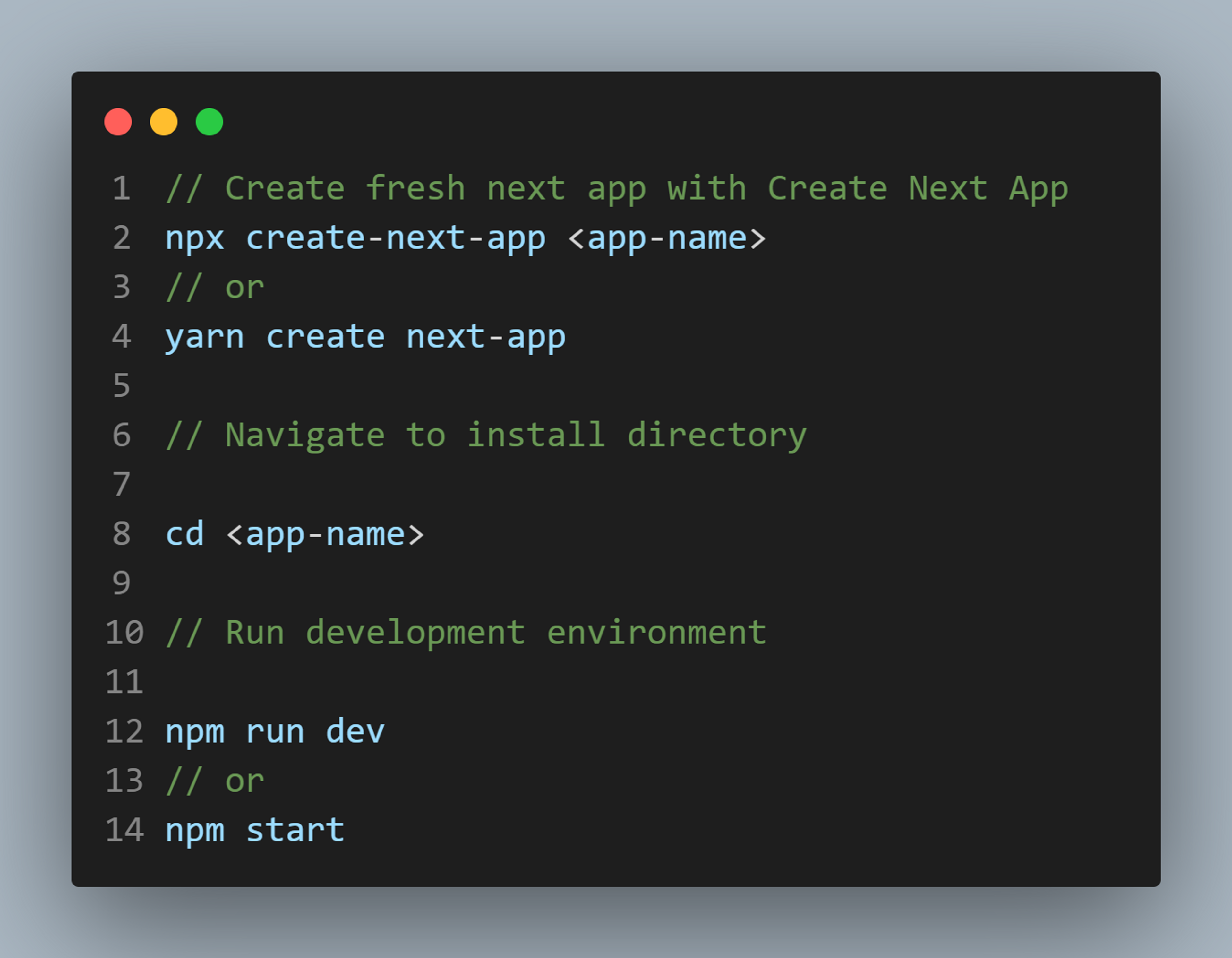 Let's create a new NextJs project by running CNA(create-next-app) command with the default template, in the terminal(personally prefer Git Bash), and follow these instructions;