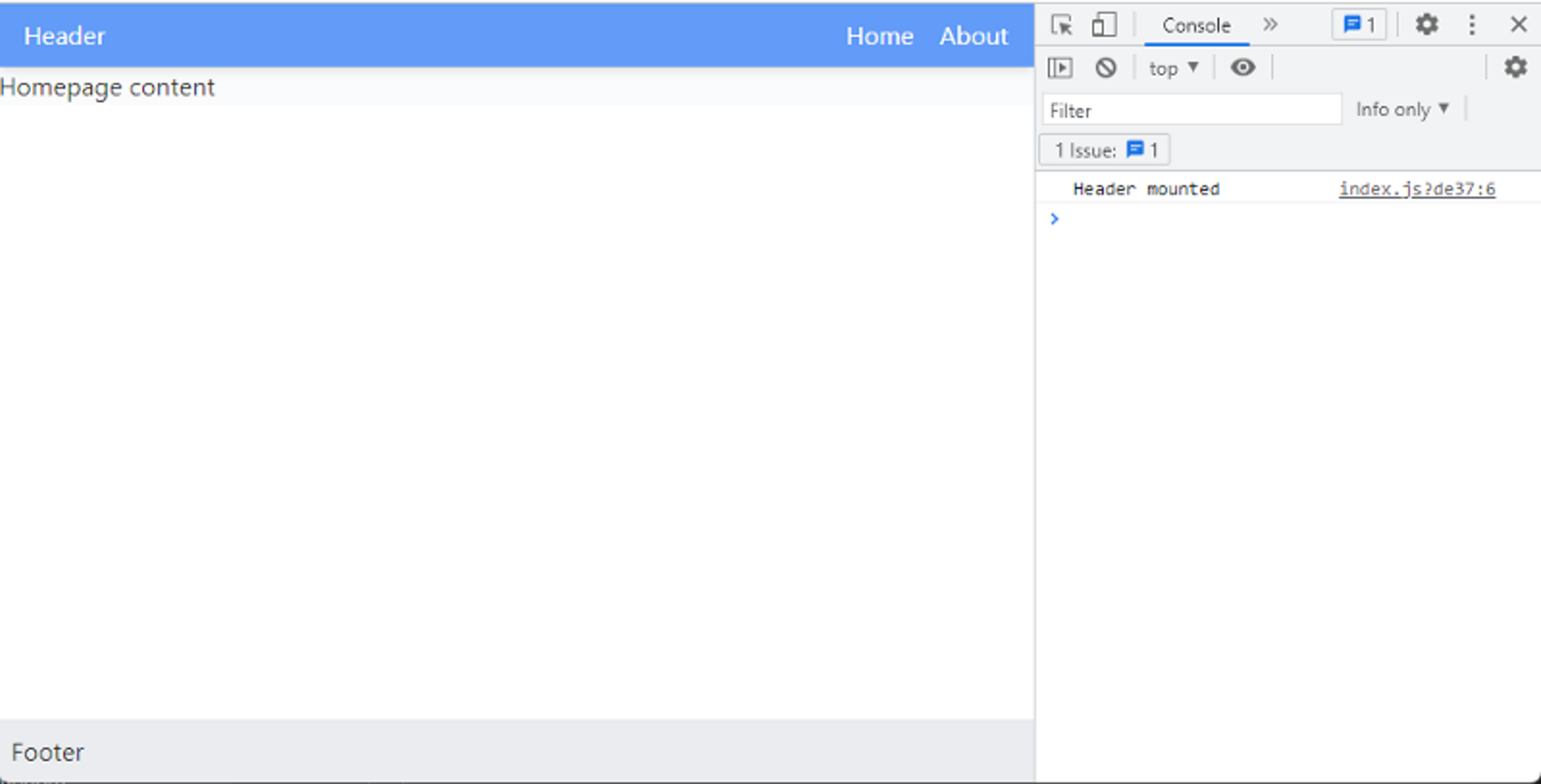 Let's test it again. clear console and refresh again. You must see a message Header mounted in the console, now try to navigate to the About page, and Boom 😍.