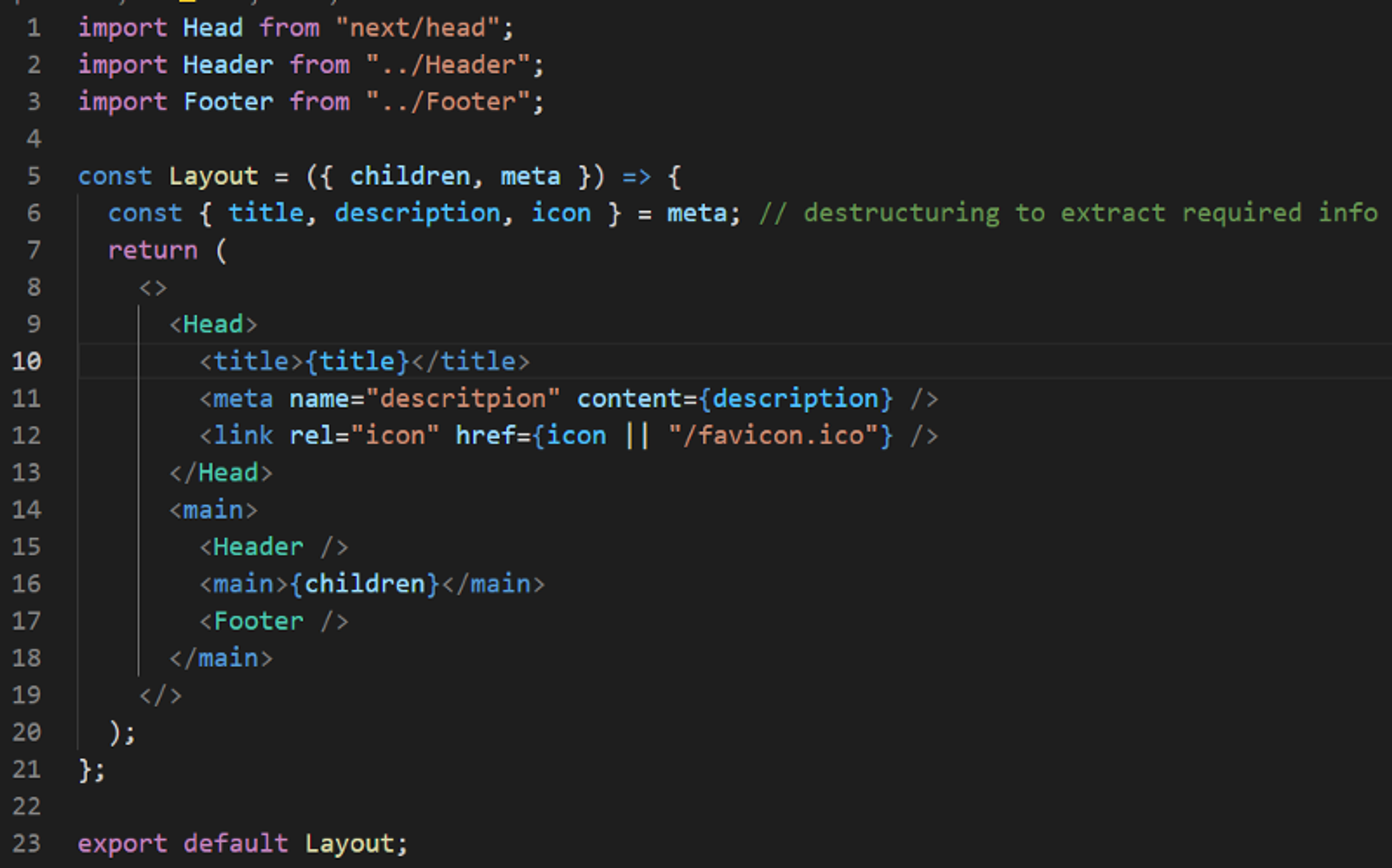 What are we doing here exactly? Nothing special. We are using the childrenprop provided by reacting, which will let us wrap pages inside Layout. Anything wrapped inside this Layout component will be added to react render tree between <main> tag at,